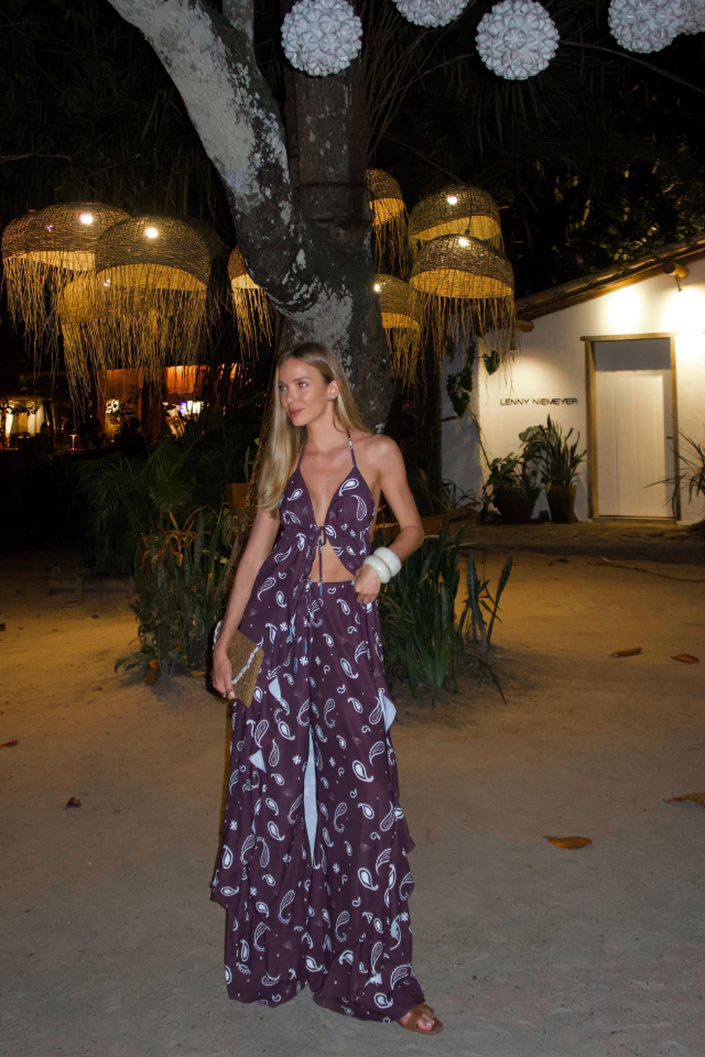 Essa calça chegou para te colocar por dentro da nova trend: a estampa Paisley. Vem em tecido alfaiataria na cor marrom, o tecido tem um toque leve e confortável. A calça possui cordão com ponteira bordada a mão no cós para amarrar na cintura, que a deixa ainda mais linda e com ótimo caimento! Tem babados na parte da perna que dão movimento e leveza para a peça, e sua modelagem é levemente pantalona. Super confortável e versátil!