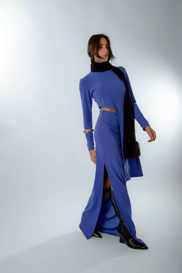 Saia longa reta em malha com ziper no cós na parte de tras e fenda em uma lateral.