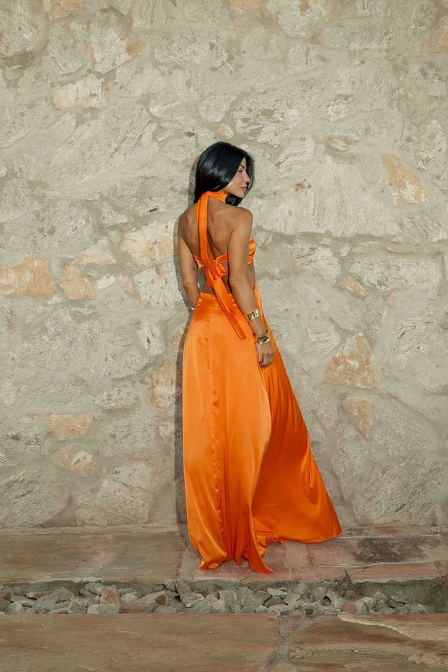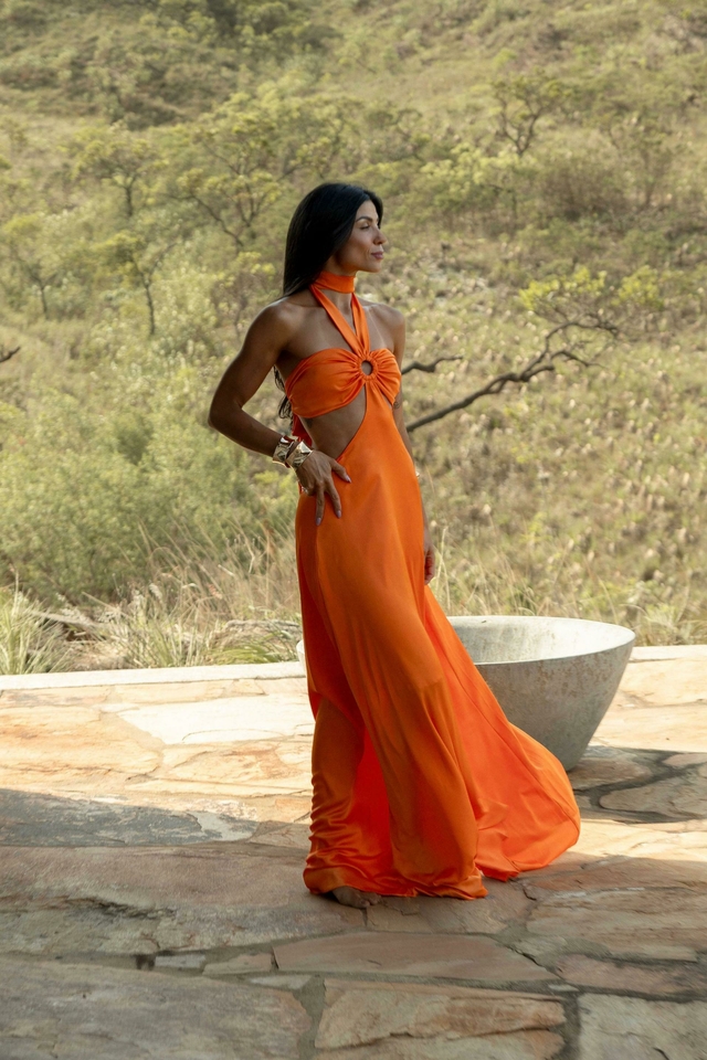 A modelagem mais charmosa desse verão chegou para te deixar ainda mais impecável! Esse vestido é aquele que para tudo sabe?! Vem em seda gloss nesse tom de Laranja que é impecável! Possui uma argola e amarrações no pescoço e nas costas. Possui também zíper invisível atrás pra fechar na parte da cintura e o leve toque de brilho? Perfeito né?! O vestido mais desejado do momento!